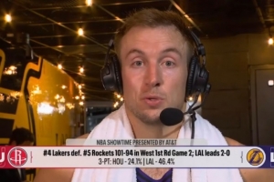 24直播网4月22日讯 NBA季后赛,湖人在主场以101-94击败火箭,大比分2-0领先。赛后肯纳德连线演播室接受了媒体采访,以下为采访全文。