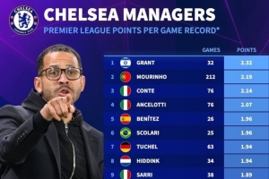蓝军新世纪17任主帅英超场均拿分:穆帅次席 罗塞尼尔、波特列倒二