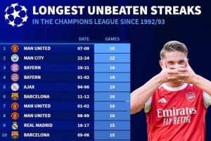 24直播网4月30日讯 本轮欧冠半决赛,阿森纳作客1-1战平马竞达成连续13场不败,《转会市场》也统计了自92-93赛季改制以来的欧冠最长连续不败榜,曼联25场独自领跑。